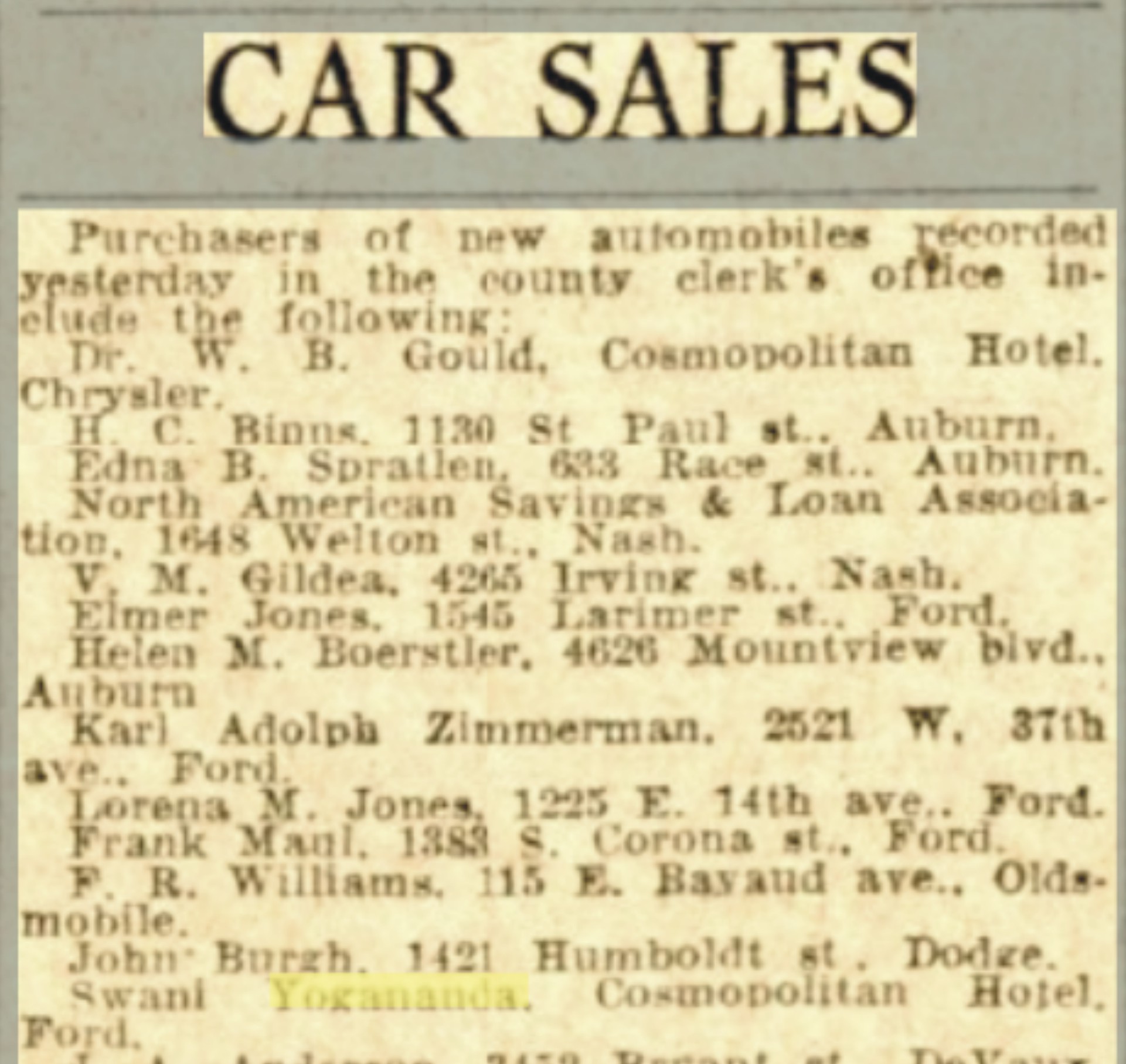 The Rocky Mountain News article also said that Swami Yogananda told them that he is traveling with his secretary across the country by automobile, being the first East Indian of high station to do this. Saturday morning he arrived from Colorado Springs on his way to San Francisco, having started from New York two months ago. Being the owner of two large schools in India he is studying intimately educational conditions and schools in America.